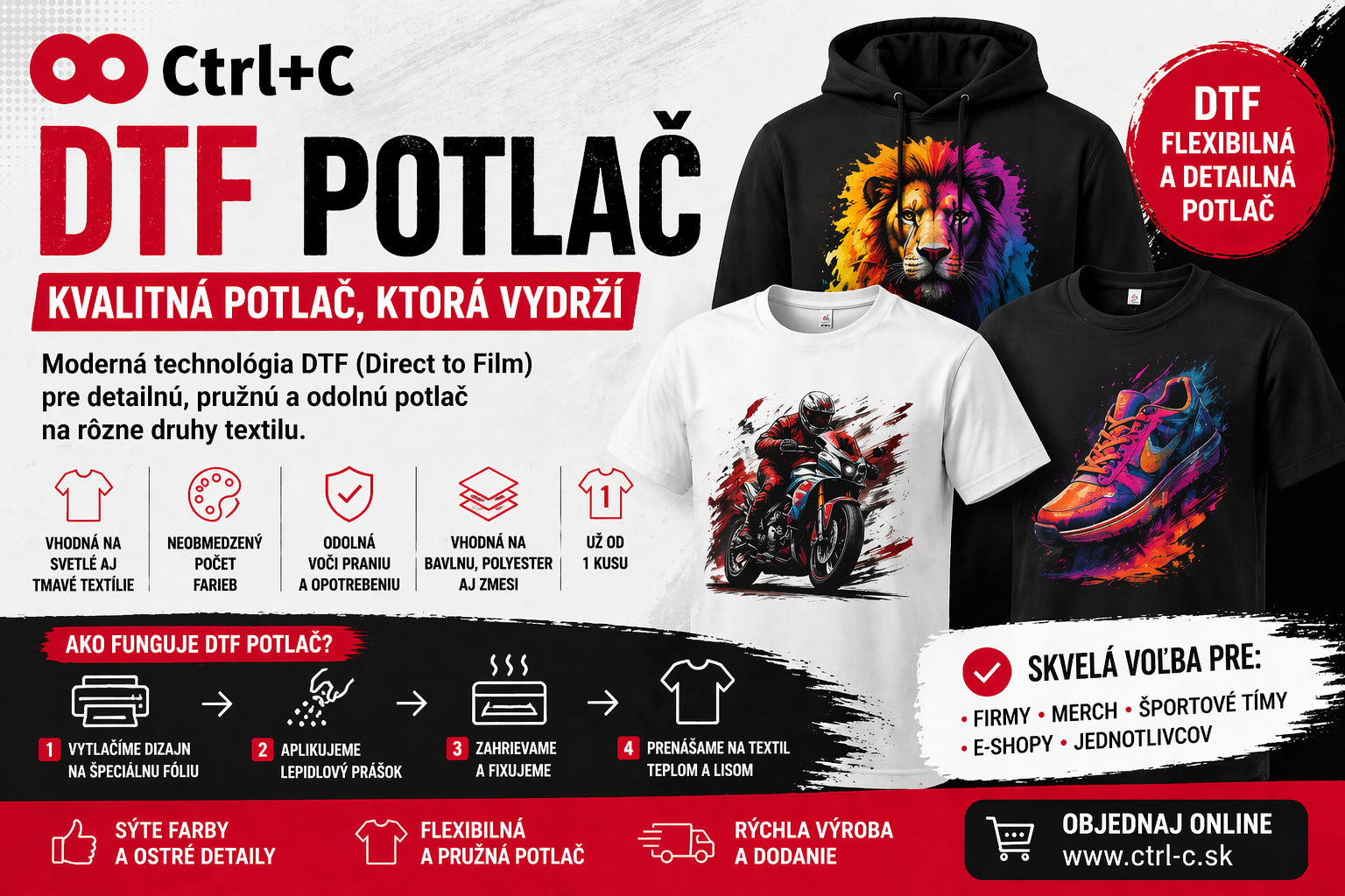 DTF je ideálne riešenie pre potlač tričiek, mikín, pracovného oblečenia, tašiek či športového textilu – bez obmedzení farieb a s vysokou kvalitou detailov.