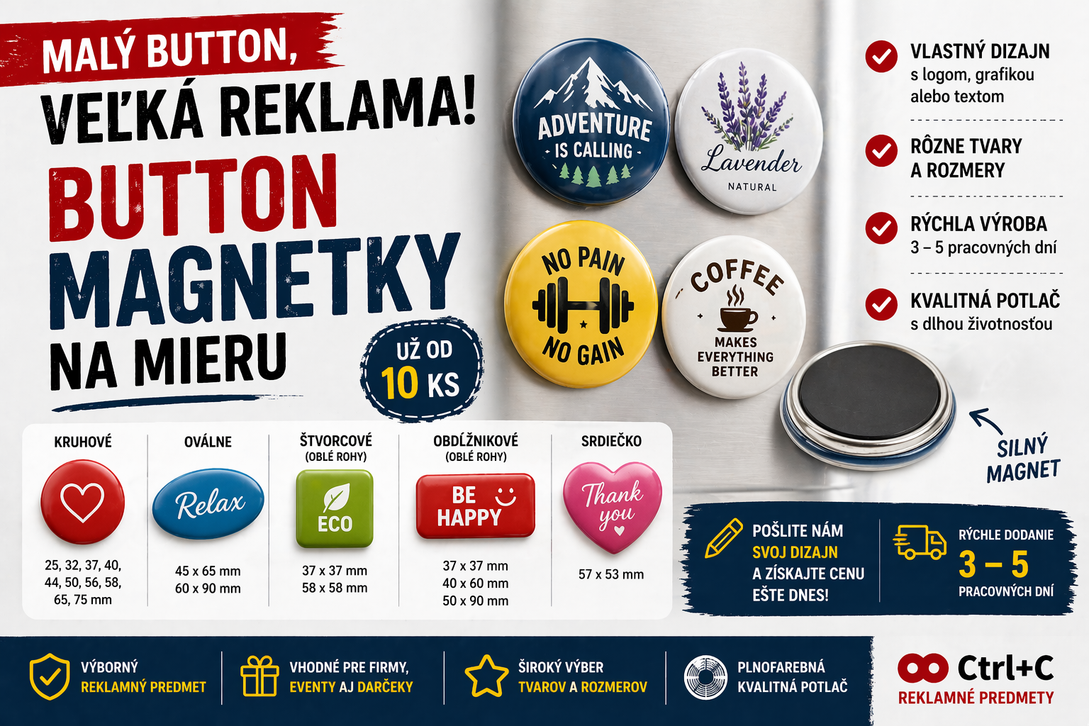 Button magnetky patria medzi najobľúbenejšie a cenovo dostupné reklamné predmety. Sú ideálne pre promo akcie, eventy, kampane aj darčeky, kde potrebujete zaujať a zostať v pamäti.