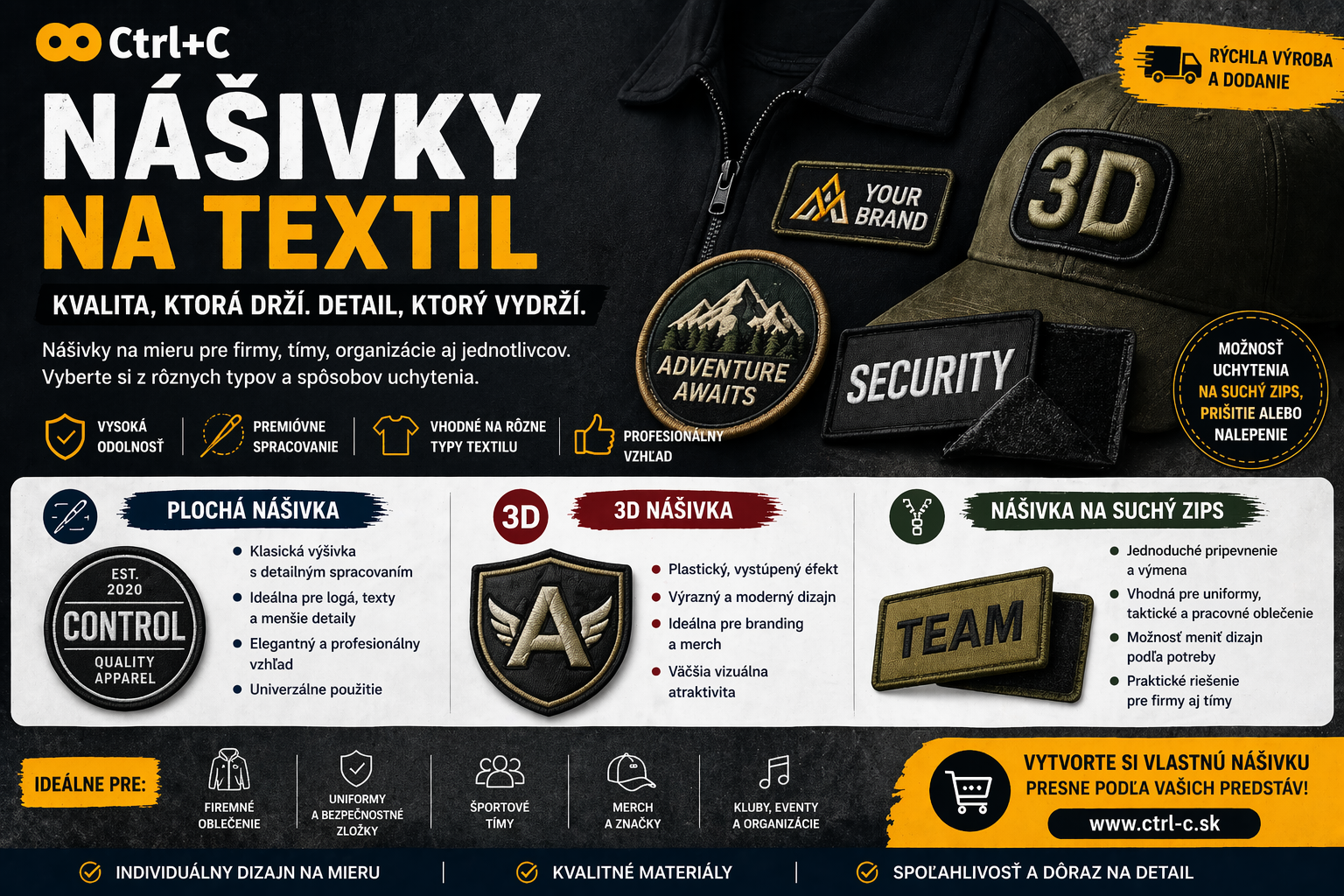 Nášivky na textil sú praktickým a zároveň štýlovým riešením pre označenie oblečenia. Vďaka svojej univerzálnosti sú ideálne pre firemné oblečenie, uniformy, športové tímy, merch aj taktické využitie.