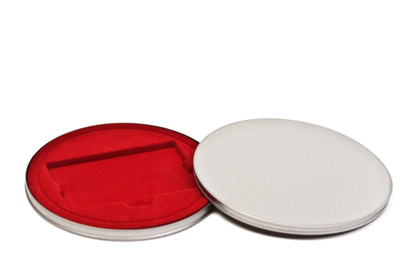 Plechový box na USB vizitku MDT 011 - elegantná okrúhla plechová krabička, do ktorej sa dá vložiť USB vizitka alebo karta, vizitka či voucher.
