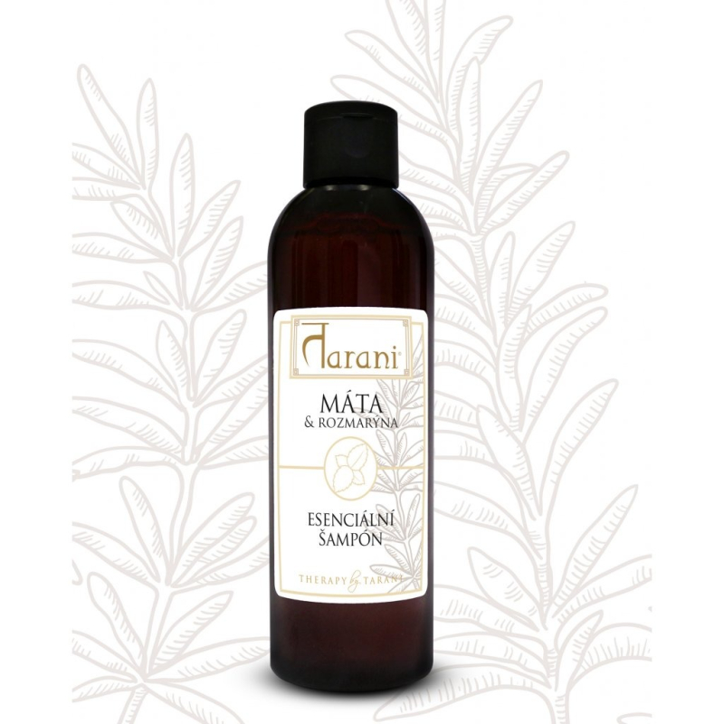 Tarani prírodný esenciálny šampón MÄTA & ROZMARÍN - esenciálny bylinný šampón pre mastné vlasy so sklonom k strate energie, okysličeniu a zdravému vzhľadu. Je vhodný pre vlasy so sklonom k masteniu, strate živosti, okysličeniu a prúdu energie v oblasti hlavy.