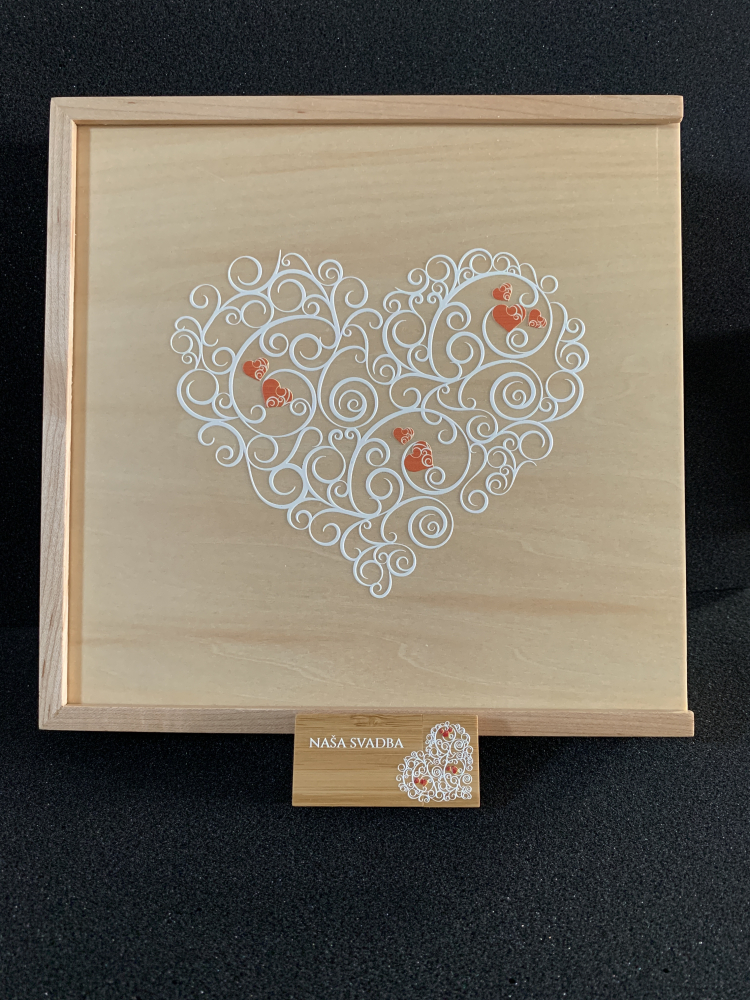 - SET "Naša svadba" SRDCE ČIPKA: USB + krabička XXL drevo
