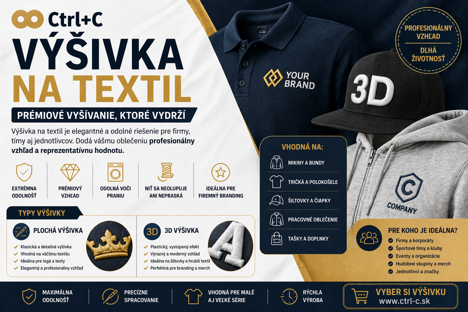 Na rozdiel od klasickej potlače je výšivka mechanicky vyšívaná niťou priamo do materiálu, čo zaručuje vysokú odolnosť, luxusný vzhľad a dlhodobú kvalitu.
